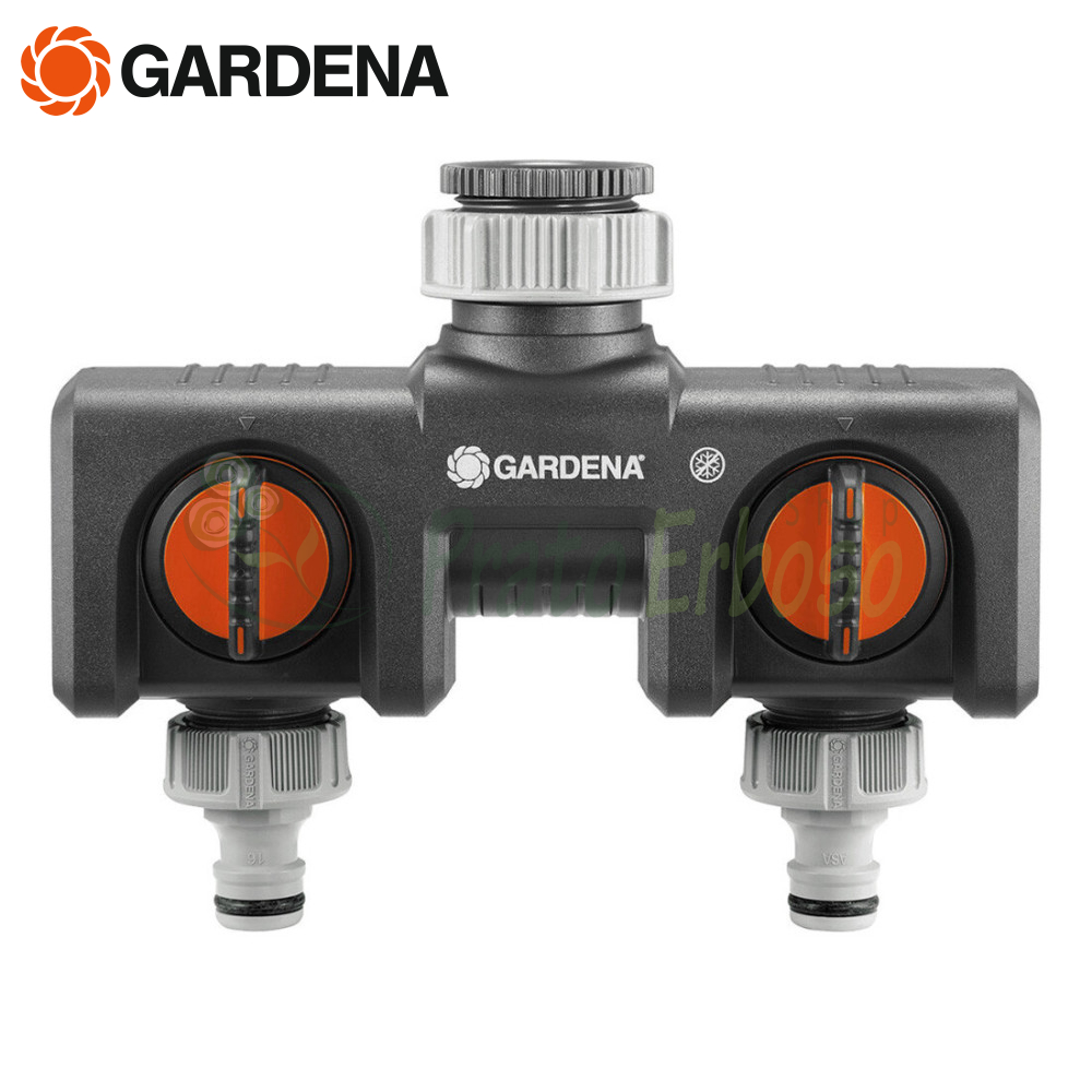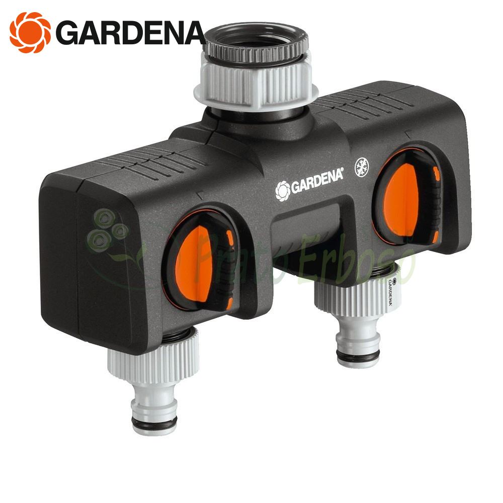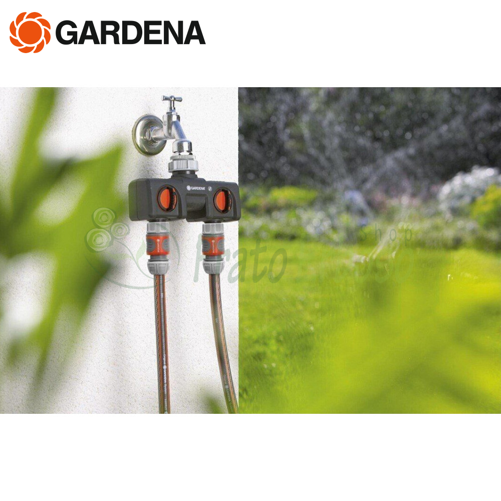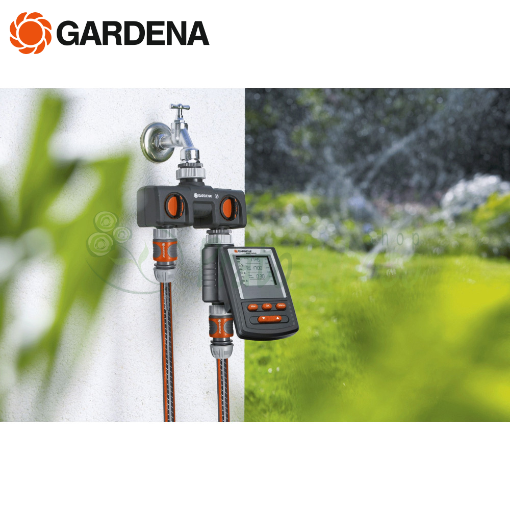Dy kompjuterë elektronikë ujitjeje Gardena ose kohëmatës uji mund të lidhen me shpërndarësin 2-kahësh.